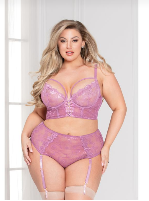 Three Piece Lace Overlay Bra, Garter Belt, And Panty Set